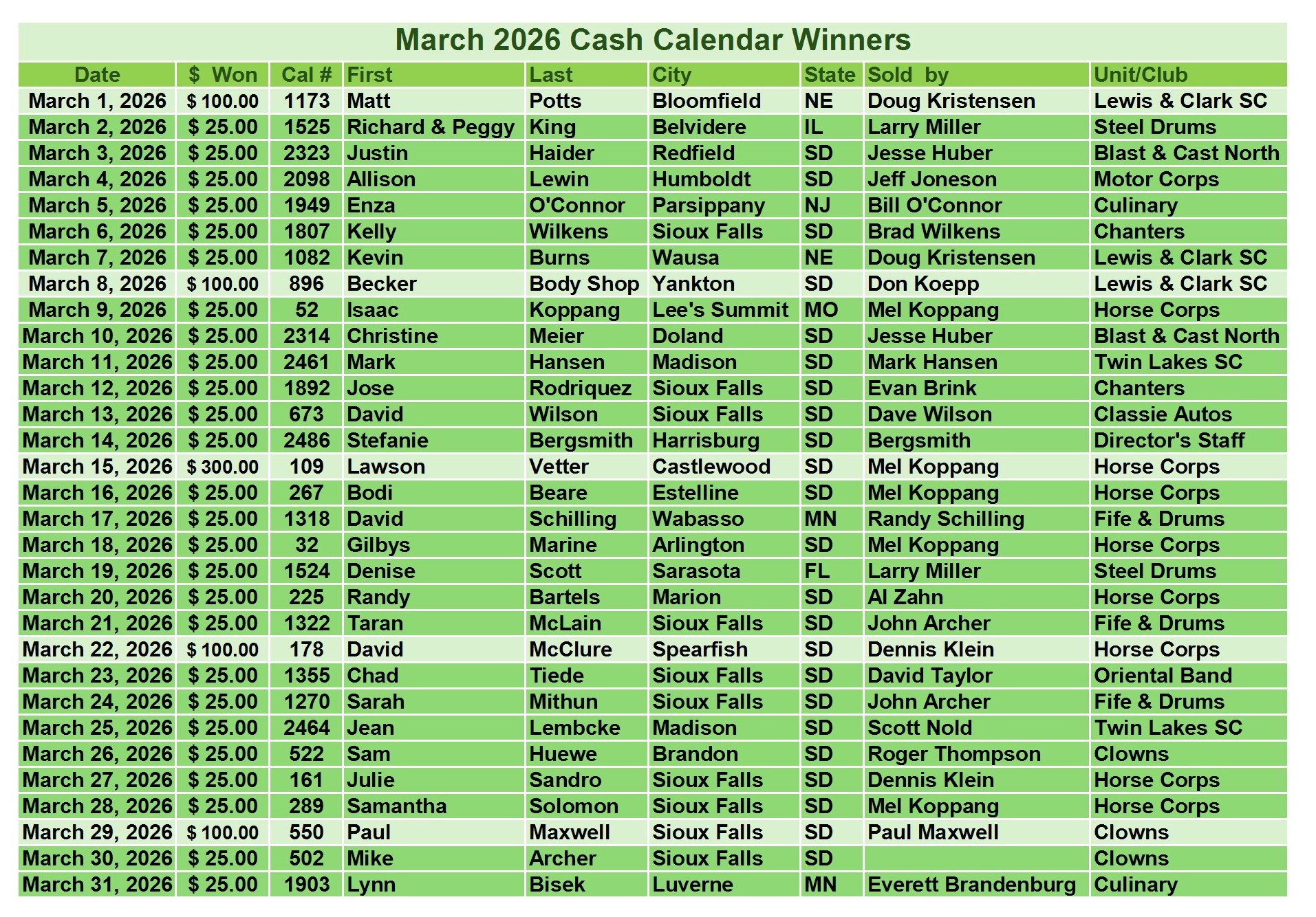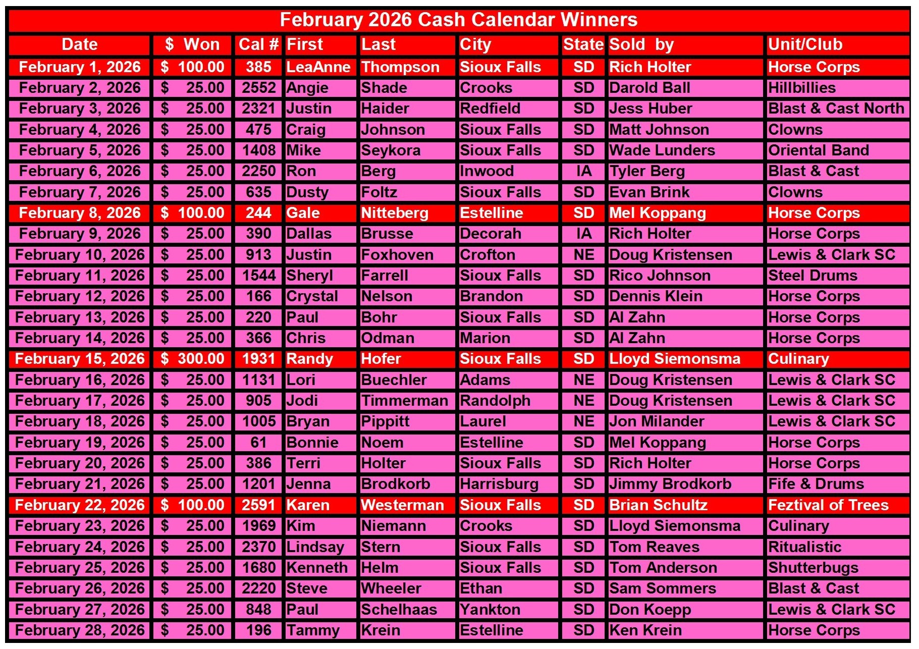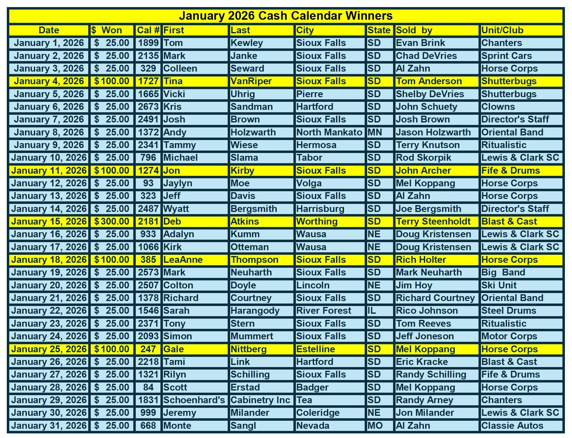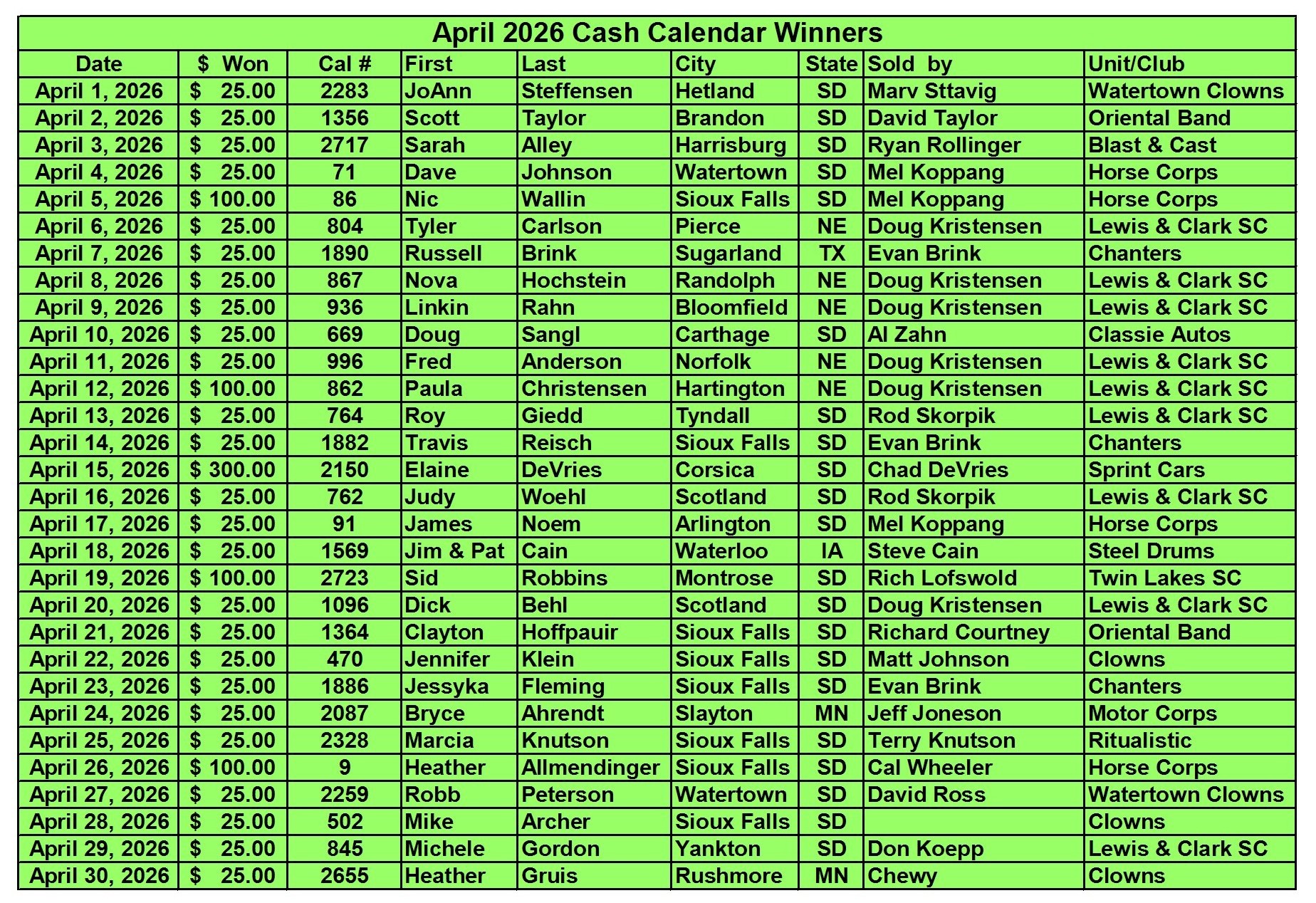 Cash Calendar Winners