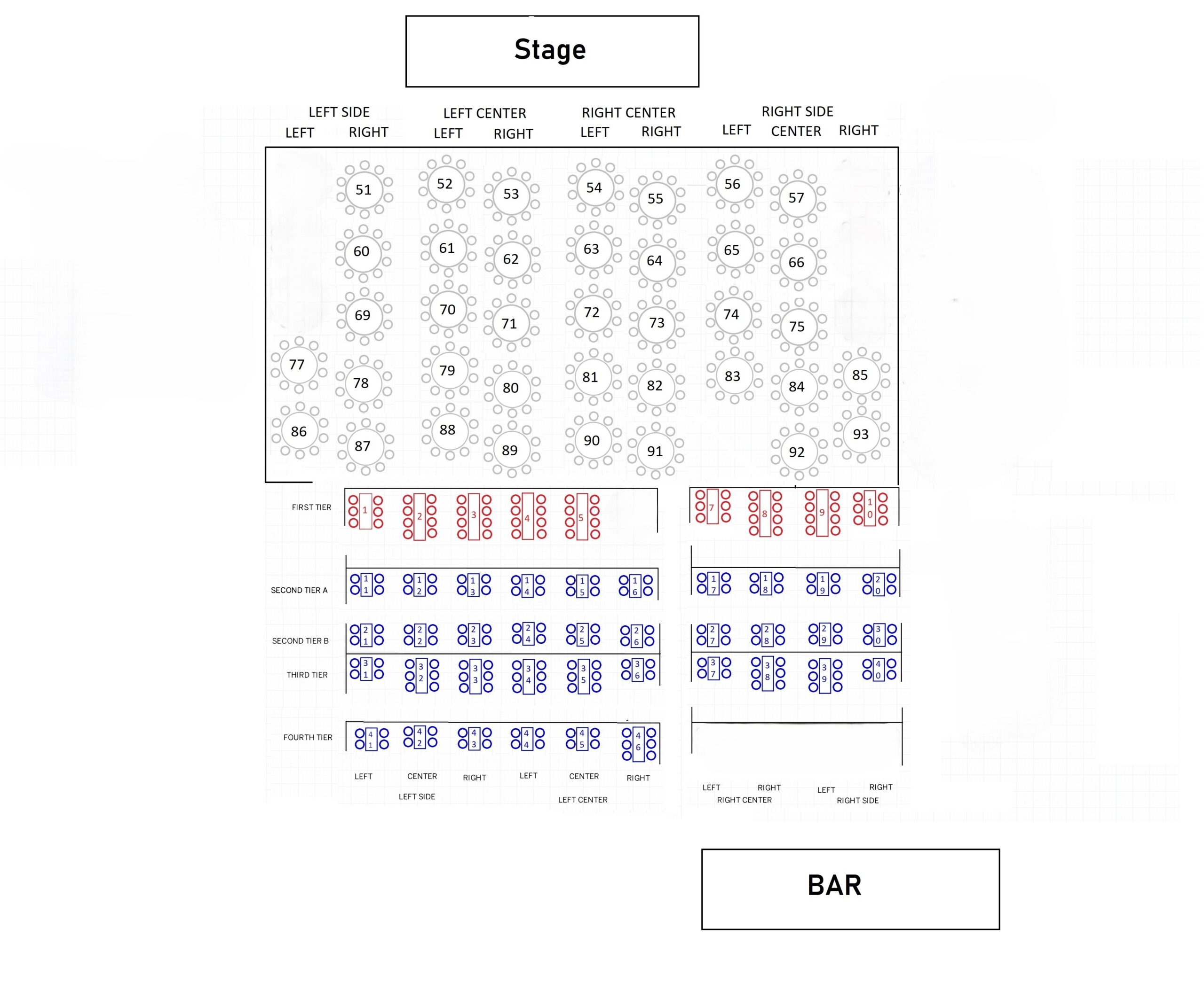 Please refer to map for approximate table locations. DANCE FLOOR SEATING (8 seats per table): Gold Ribbon tables - $400 (includes 1 drink tickets and a fudge plate per seat); Silver Bell tables - $300 (includes 1 drink tickets and a fudge plate per seat). TIER SEATING: Tier 1 Rudolph Red Nose Reindeer (Tables of 6 - $150 or Tables of 8 - $200); Tiers 2-4 Santa's Helpers (Tables of 4 - $100 or Tables of 6 - $150).