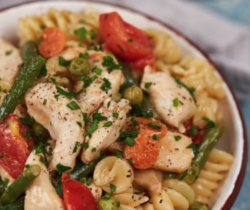 On the menu: chicken pasta primavera, salad, bread, and dessert for $9.
